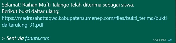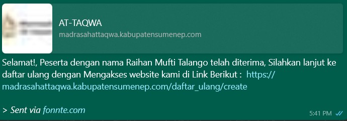 Jika pendaftaran Diterima/Ditolak akan terkirim pesan Otomatis ke nomor whatsapp (dicontoh itu kondisi jika di terima)