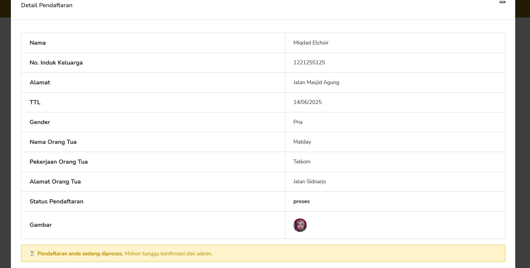 Pada form tersebut tertera Sedang menunggu Konfirmasi admin atau Sedang di"Proses" pada halaman utama...